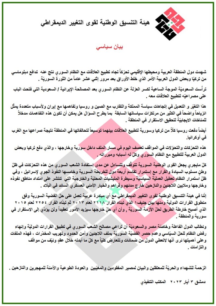 بيان سياسي من هيئة التنسيق الوطنية لقوى التغيير الديمقراطي Posted on 02/05/2023 بواسطة Admin شارك هذا الموضوع:المزيد انقر للمشاركة على WhatsApp (فتح في نافذة جديدة) WhatsApp Tweet النقر لإرسال رابط عبر البريد الإلكتروني إلى صديق (فتح في نافذة جديدة) البريد الإلكتروني اضغط للطباعة (فتح في نافذة جديدة) طباعة انقر للمشاركة على Telegram (فتح في نافذة جديدة) Telegram مرتبط