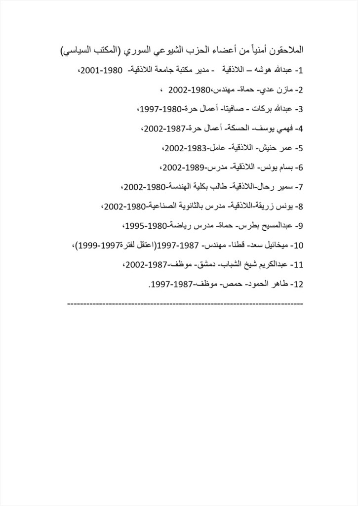 قائمة بمعتقلي الحزب الشيوعي السوري ( المكتب السياسي ) + قائمة بالملاحقين أمنيا Posted on 12/07/2025 بواسطة zaim999976ebdc3d5f شارك هذا الموضوع:المزيد مشاركة على واتساب (فتح في نافذة جديدة) WhatsApp Tweet Email a link to a friend (فتح في نافذة جديدة) البريد الإلكتروني اطبع (فتح في نافذة جديدة) طباعة مشاركة على تيليجرام (فتح في نافذة جديدة) Telegram مرتبط