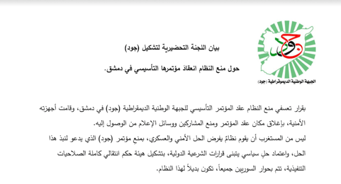 بيان اللجنة التحضيرية لتشكيل (جود) حول منع النظام انعقاد مؤتمرها التأسيسي في دمشق