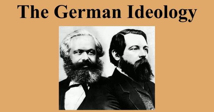 رَكَّز ماركس وانجلز في “الأيديولوجيا الألمانية” على نقد مثالية الفيلسوف الألماني “جورج هيغل” وأنصاره الشباب، والفيلسوف “لودفيغ فيورباخ”، والمذهبين الفردي والفوضوي، إلى جانب نقد مجمل الفكر الألماني الفلسفي السائد في القرن التاسع عشر، والذي اعتبراه فكراً برجوازياً، وصنفاه بأنه فكر معاد لطبقة البروليتاريا.