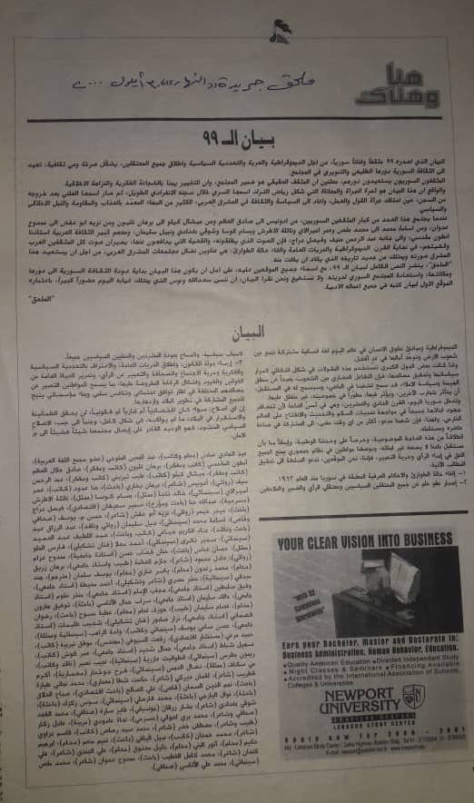 (صدر بيان الـ ٩٩ في ٢٧ أيلول/سبتمبر عام ٢٠٠٠ في صحف "النهار" و "السفير" و "الحياة"، ونشر في ملحق جريدة النهار في ٣٠ أيلول/سبتمبر عام ٢٠٠٠.)، وسمي البيان بهذا الاسم لأن عدد من وقع عليه كان ٩٩ شخصاً. نص البيان: الديمقراطية ومبادئ حقوق الإنسان في عالم اليوم لغة إنسانية مشتركة تجمع بين شعوب الأرض وتوحد … متابعة القراءة بيان الـ ٩٩